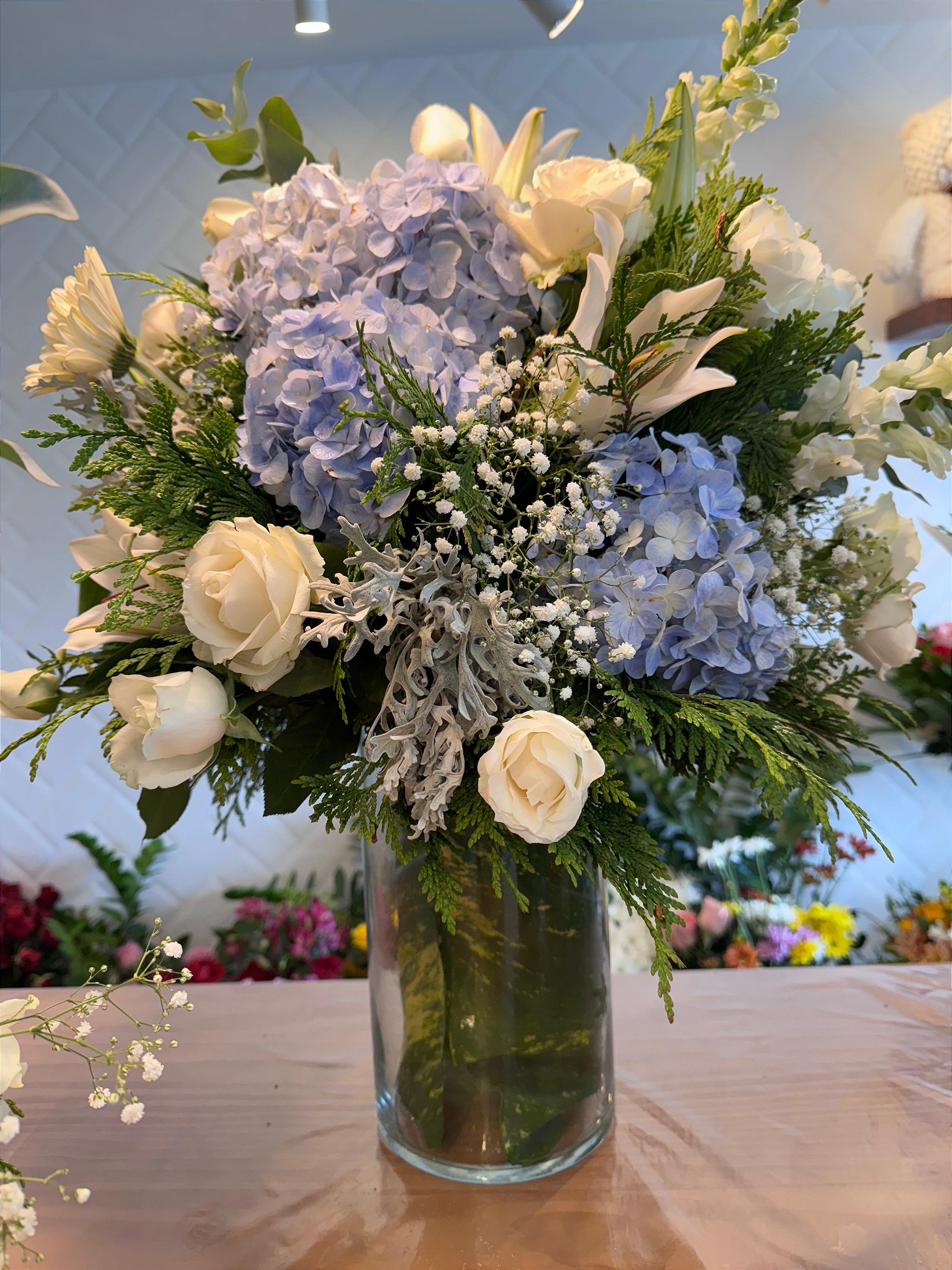 Apresentamos nossos elegantes arranjos de festa, disponíveis em tamanhos Grande, médio e pequeno, perfeitos para qualquer celebração. Combinando flores em tons de azul, verde e branco, cada arranjo é um toque de frescor e sofisticação para sua decoração. Ideal para festas de todos os tipos, esses arranjos irão encantar seus convidados e transformar qualquer ambiente em uma experiência memorável. 🌿💙🤍