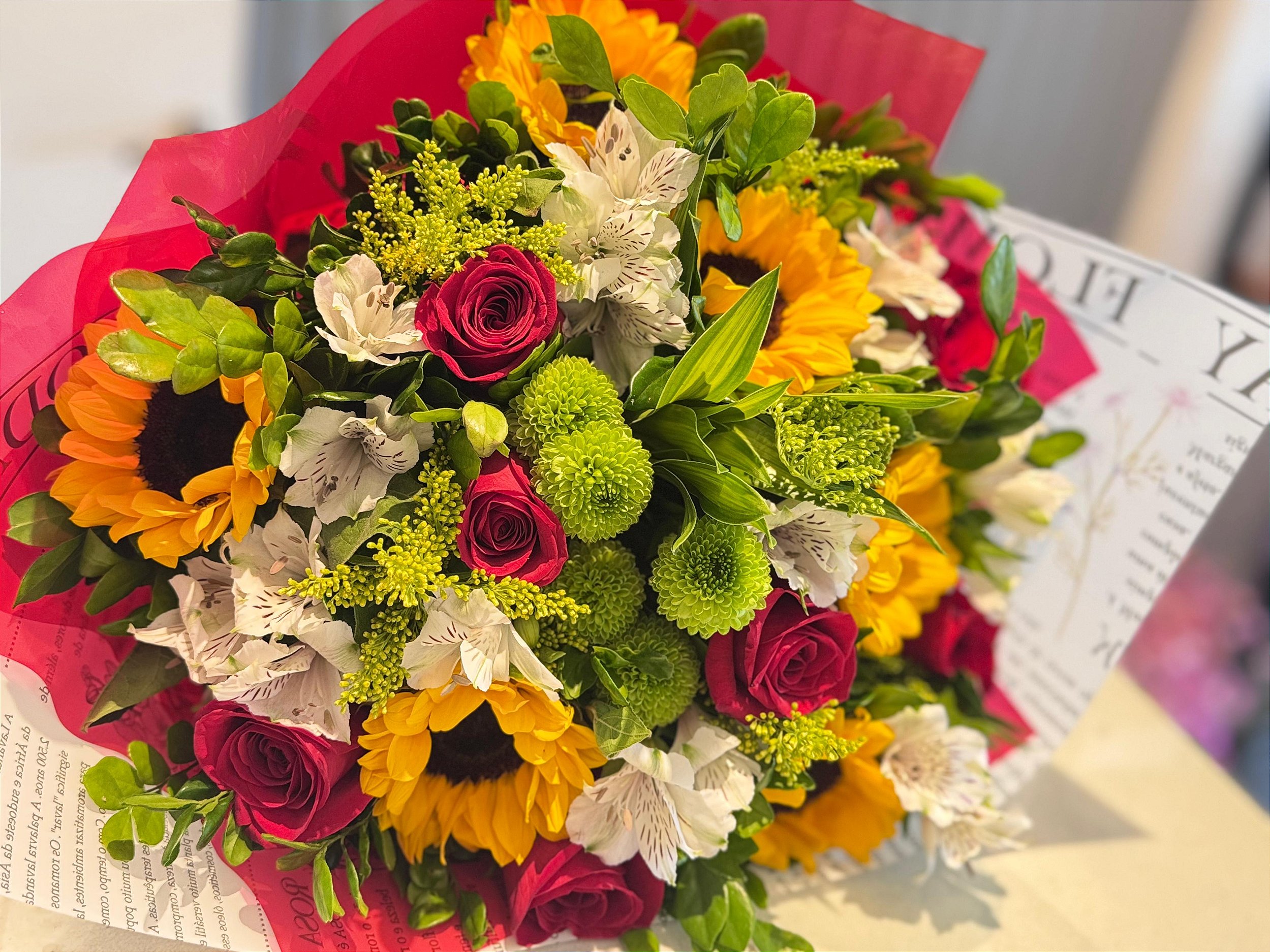Um buquê vibrante e cheio de vida, combinando o calor dos girassóis com a delicadeza das rosas vermelhas e o frescor das flores brancas. A harmonia das cores transmite alegria, carinho e boas energias, tornando este arranjo perfeito para surpreender em qualquer ocasião especial. Ideal para presentear com amor, gratidão ou simplesmente espalhar sorrisos.