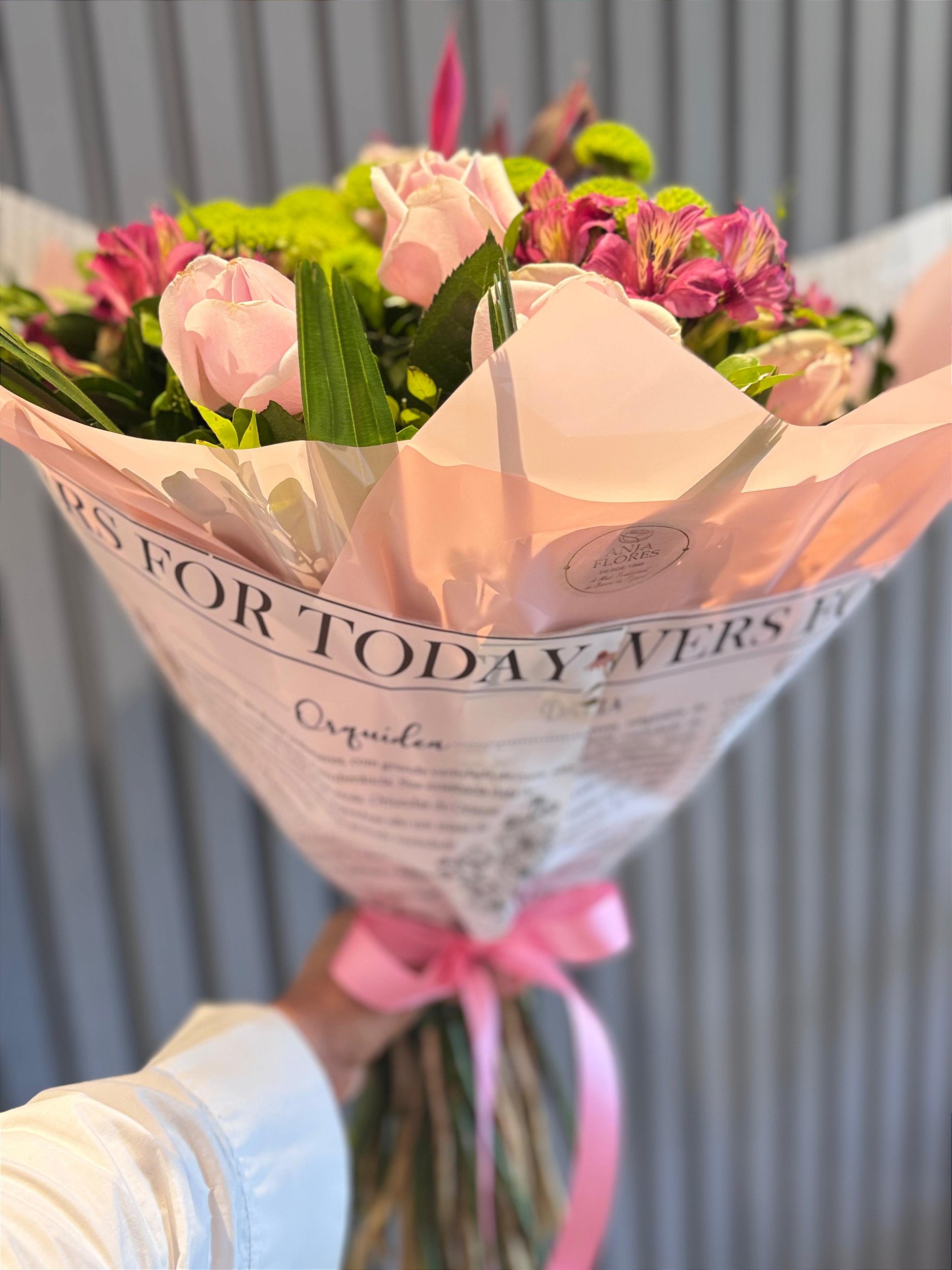 Um arranjo delicado e romântico, com rosas cor-de-rosa que simbolizam carinho e ternura, combinadas ao charme dos botões verdes e flores em tons vibrantes de pink. O mix de cores suaves e alegres transmite leveza, afeto e boas energias. Perfeito para surpreender em aniversários, agradecimentos, celebrações românticas ou para tornar qualquer dia mais especial.