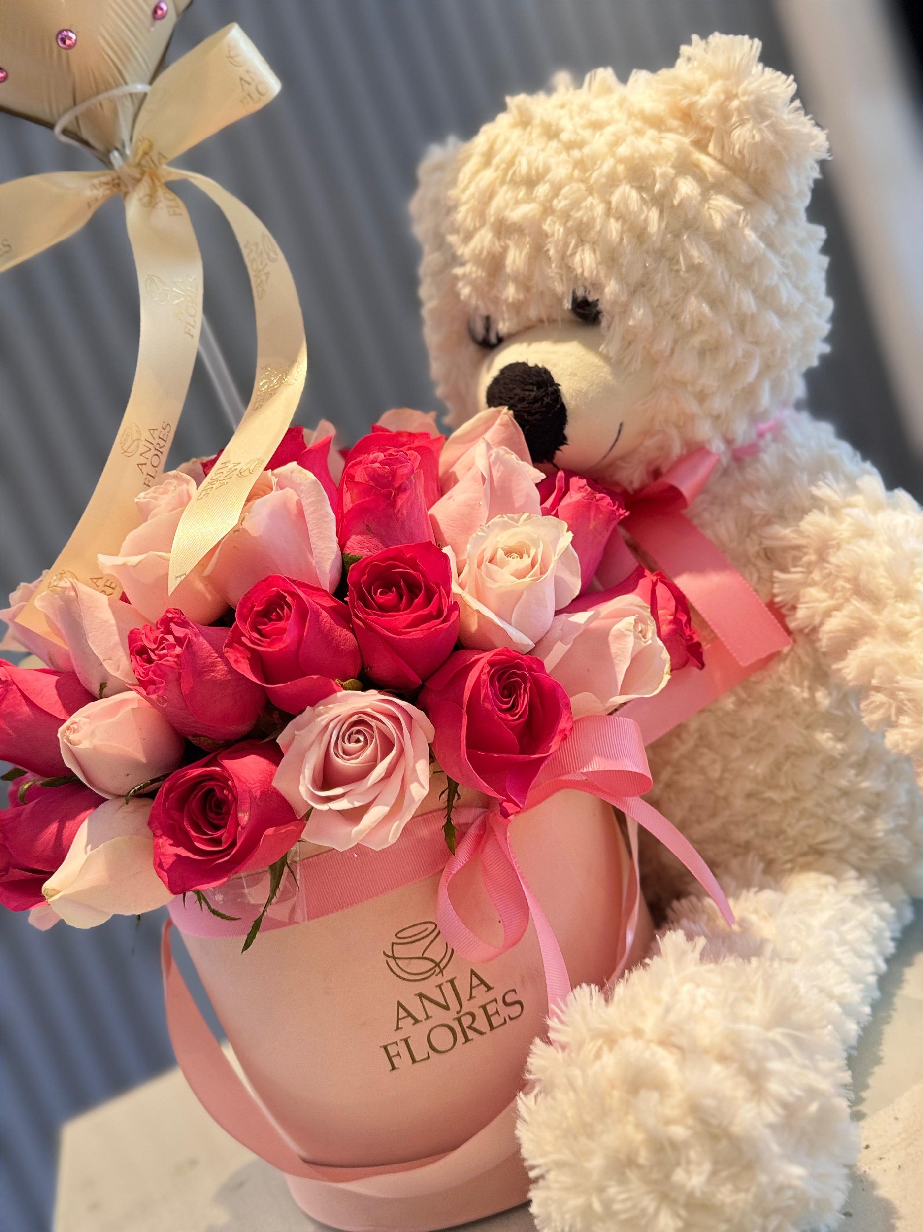 Nosso charmoso ursinho de pelúcia acompanha uma elegante caixa rosa da Anja Flores, repleta de rosas em tons delicados e apaixonantes.