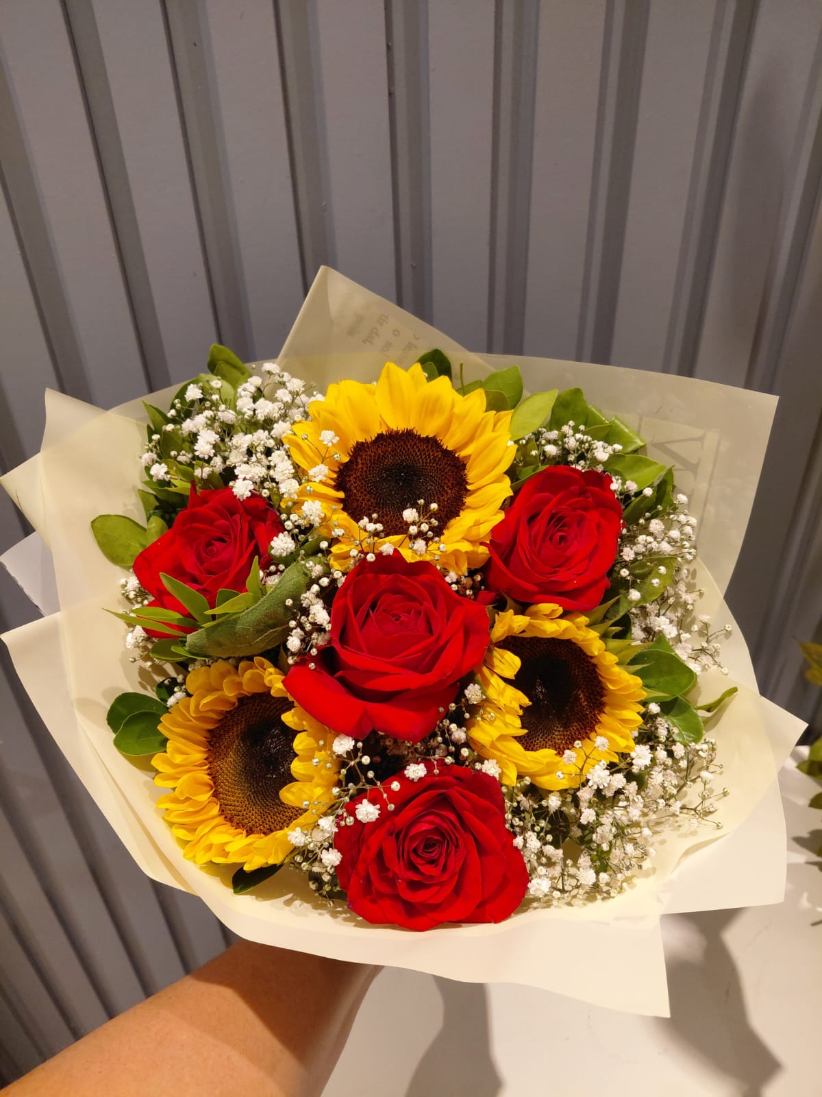 O Buquê Sol & Amor é a união perfeita entre a intensidade das rosas vermelhas e a alegria vibrante dos girassóis. Um arranjo cheio de significado, que transmite amor, luz e boas energias. Com folhagens frescas e delicados toques de chuva de prata, é ideal para surpreender em aniversários, declarações, agradecimentos ou para iluminar o dia de alguém especial. Um presente marcante, feito com carinho pela Anja Flores.